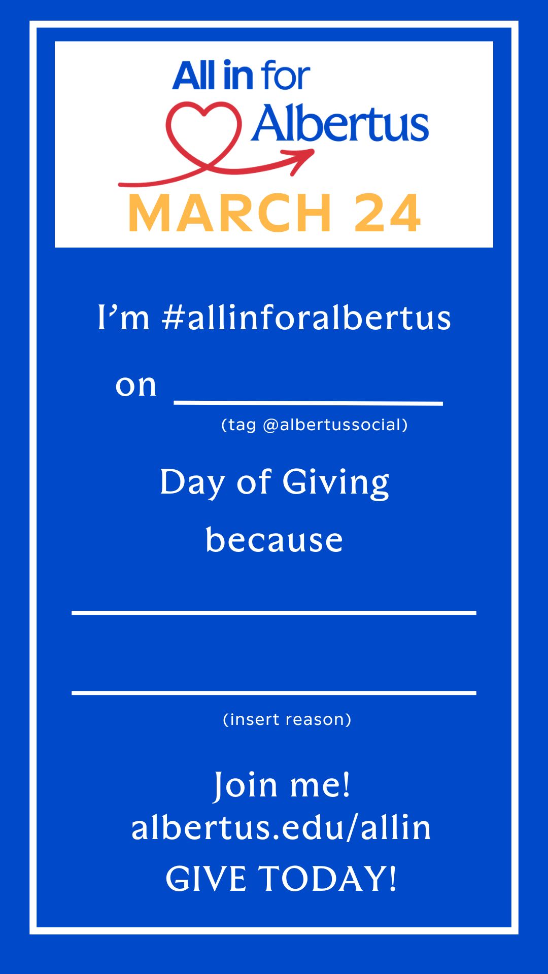 Use this template on your Instagram and/or Facebook Stories, and type in your responses. Make sure to type #allinforalbertus to make your stories searchable.